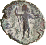 Poseidon standing facing, head right, holding chlamys, dolphin and trident