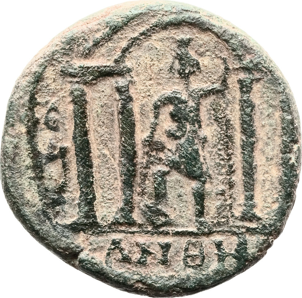 front view of temple with four columns with arcuated lintel, within which Tyche standing facing turreted, head left, holding down uncertain object and spear and placing foot on prow