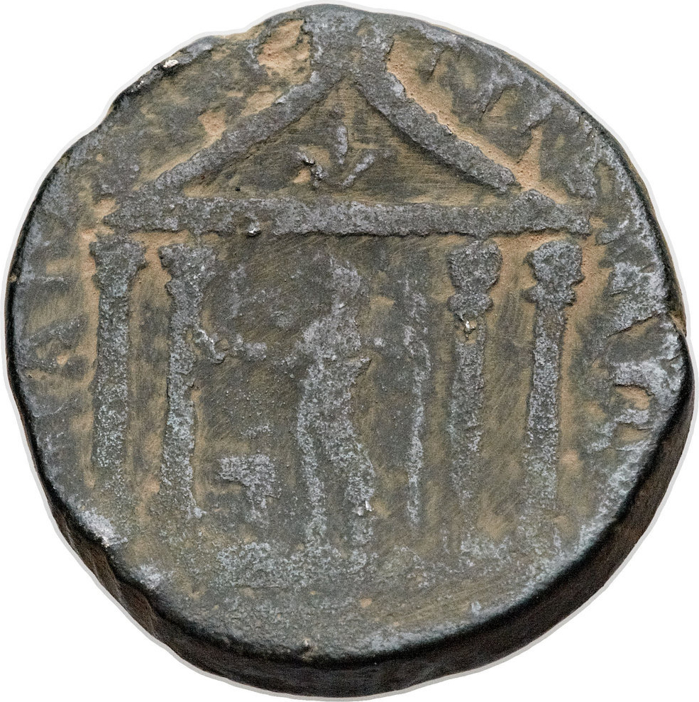 front view of temple with four columns, within which Zeus(?) standing, left, holding long sceptre and Nike(?); at his feet, altar(?); in the pediment, anchor(?)