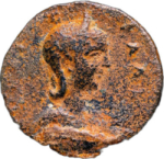 front view of temple with two columns, within which Tyche standing facing, head left, wearing kalathos, holding cornucopia and rudder, placing foot on galley prow; to r, pedum |