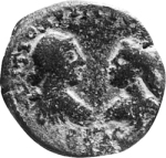 facing draped busts of Zeus(?), left, and Astarte(?), left |