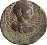 front view of shrine with two columns with arcuated lintel, within which Tyche standing facing turreted, head right, holding spear and Nike, placing foot on river god swimming, left; at either side, small figure standing on basis, holding torch(?) |