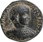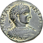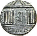 front view of temple with eight columns with superstructure, within which Zeus(?) seated, left, holding long sceptre and patera(?); date in pediment |