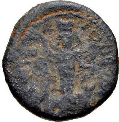 Zeus Heliopolites standing facing between two heifers, wearing kalathos, holding sceptre with bird-shaped tip and small Victory offering him a wreath