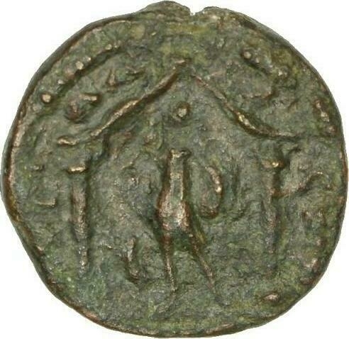 temple with two columns with statue of Artemis, holding bow in one hand and arrow(?); to left, horned animal
