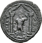 front view of temple with two columns, within which Zeus Ammon-Sarapis standing facing, head left, wearing kalathos, holding long sceptre and patera; at his feet, ram(?), left