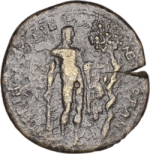 Heracles standing nude facing, head right, resting on club, holding lion skin; to right, serpent coiling around apple tree of the Hesperides