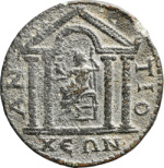 temple with four columns and rounded pediment enclosing statue of Zeus seated, left, holding Nike and sceptre
