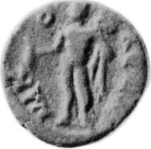 Hermes standing left, holding purse and caduceus