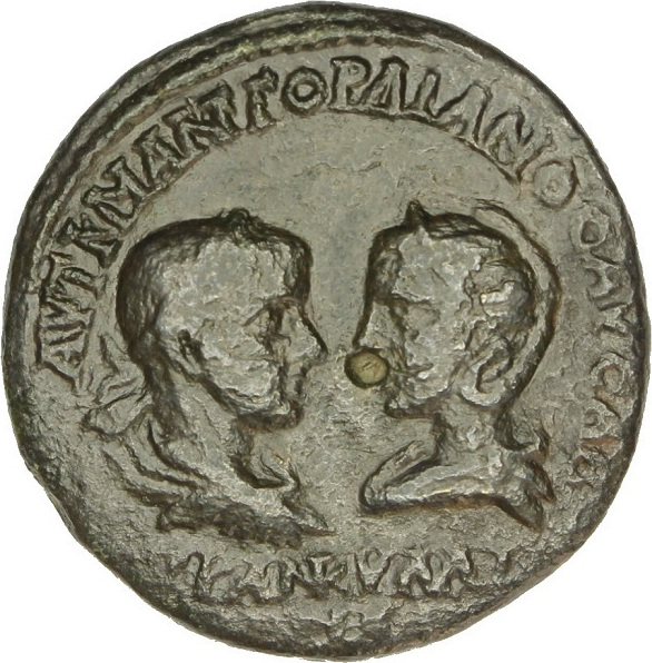 confronted busts of Gordian III, laureate, draped and cuirassed, right, seen from rear, and Tranquillina, diademed and draped bust, left