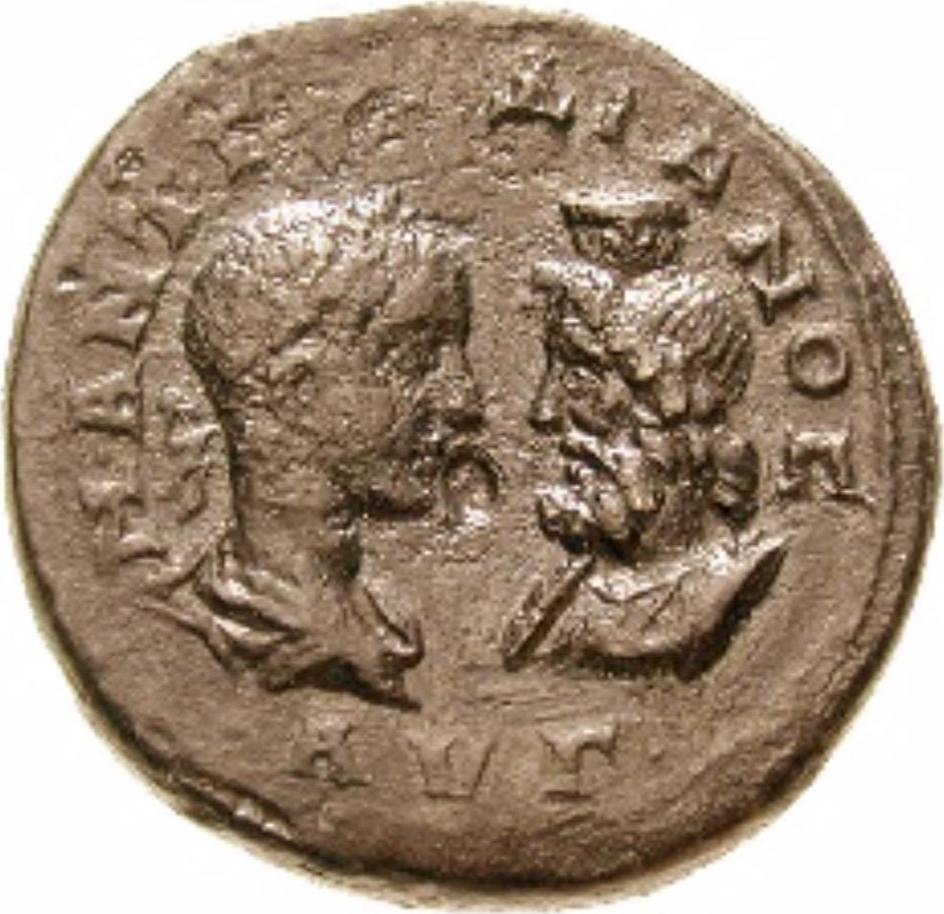confronted busts of Gordian III, laureate, draped and cuirassed, right, seen from rear, and Sarapis, draped, left