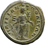 Tyche standing facing, head left, holding rudder and cornucopia