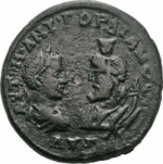 confronted busts of Gordian III, laureate, draped and cuirassed, right, seen from rear, and Sarapis, draped, left, with cornucopia behind him