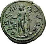 Hermes standing left, holding caduceus and chlamys