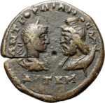 confronted busts of Gordian III, laureate, draped and cuirassed, right, seen from rear, and Sarapis, draped, left, with cornucopia behind him