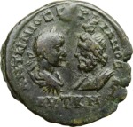 confronted busts of Gordian III, laureate, draped and cuirassed, right, seen from rear, and Sarapis, draped, left
