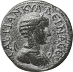 diademed and draped bust of Tranquillina, right, crescent at shoulders
