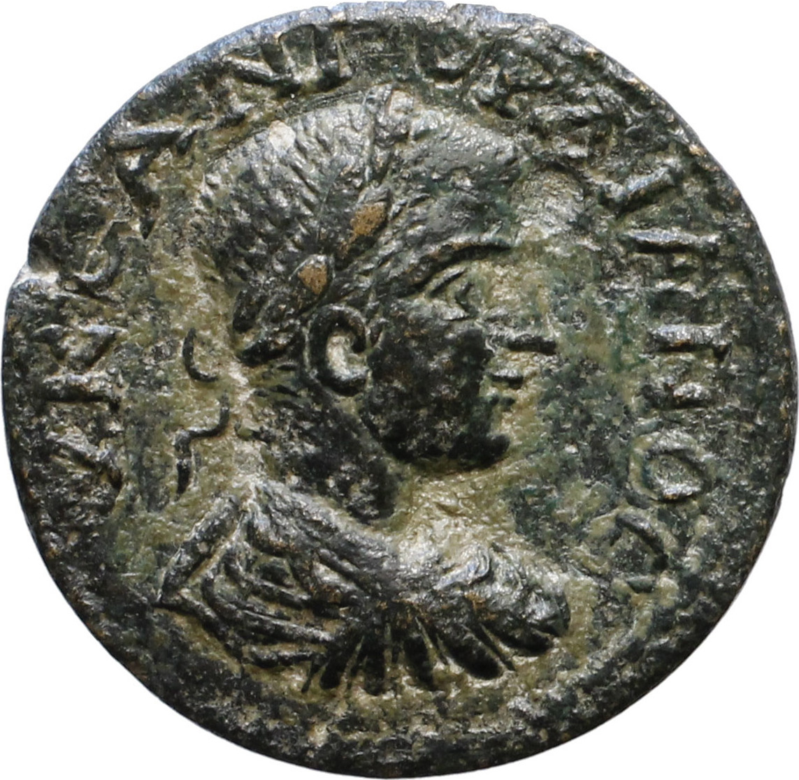 laureate, draped and cuirassed bust of Gordian III, right, seen from rear