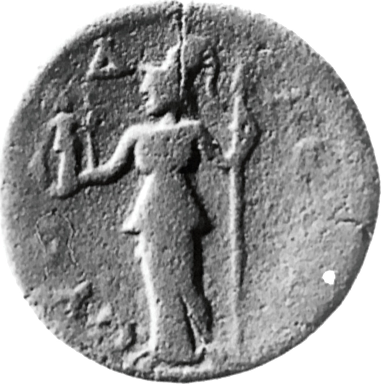 Athena standing left, holding Nike and spear