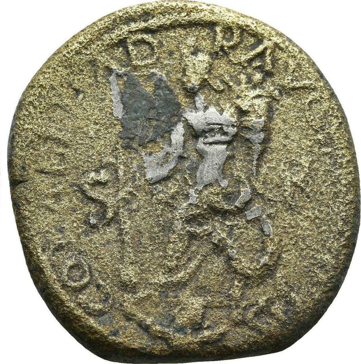 Fortuna seated left, holding harpa of Perseus and cornucopia; at feet, rudder; below, river god swimming left |
