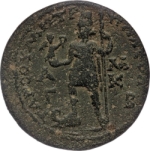 Tyche standing left, holding Nike (standing right, holding branch and palm), and vertical spear, right foor on prow of ship |