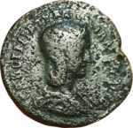 Cybele seated left, holding patera and resting on tympanum; at feet, a lion on each side of the throne |