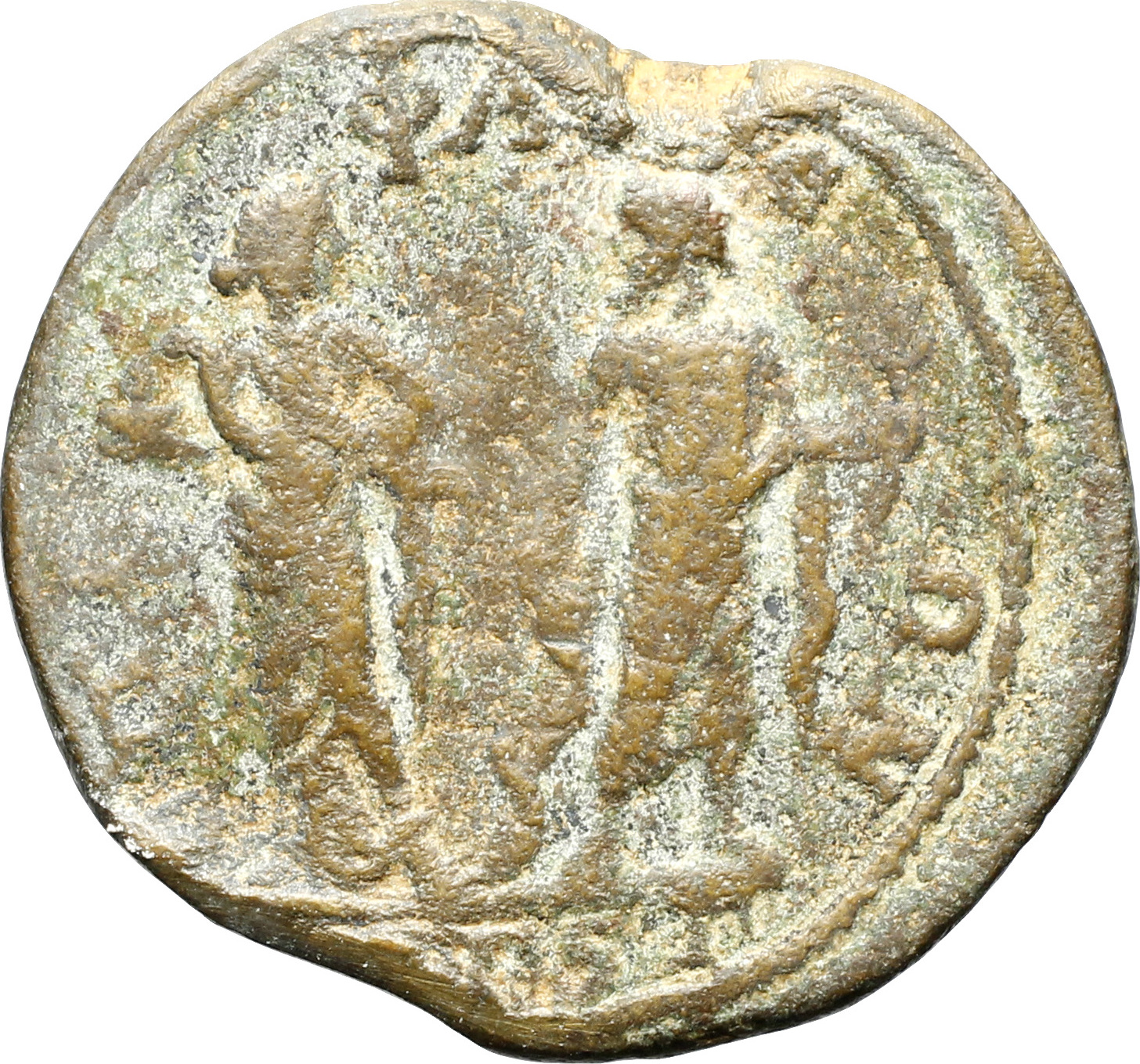 Hygieia standing right, feeding serpent from patera, facing Asclepius standing left, holding serpent staff and branch