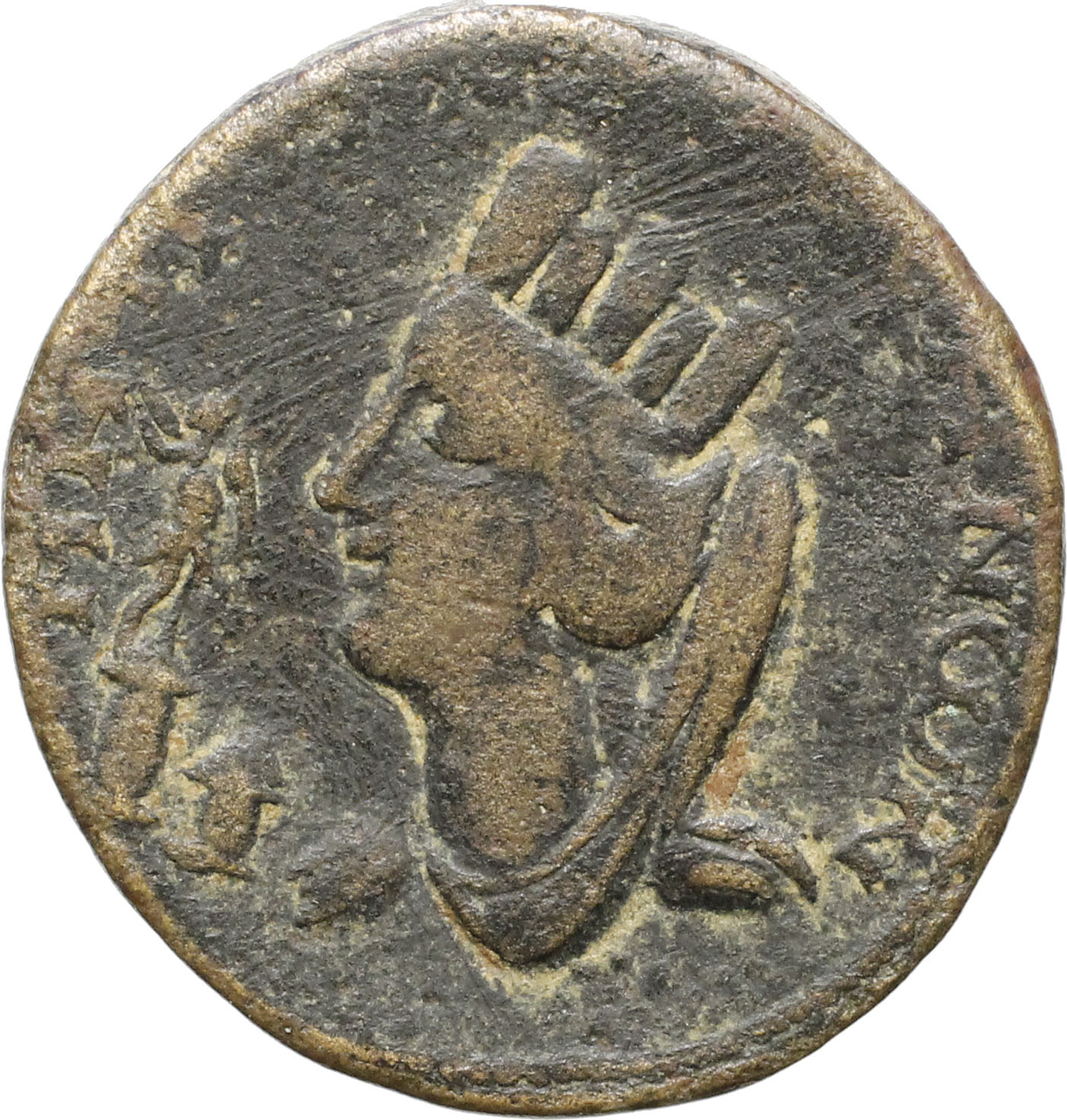 draped, veiled and turreted bust of Tyche, left; in front, Marsyas (?) standing right, on short column, carrying wineskin over shoulder, and altar