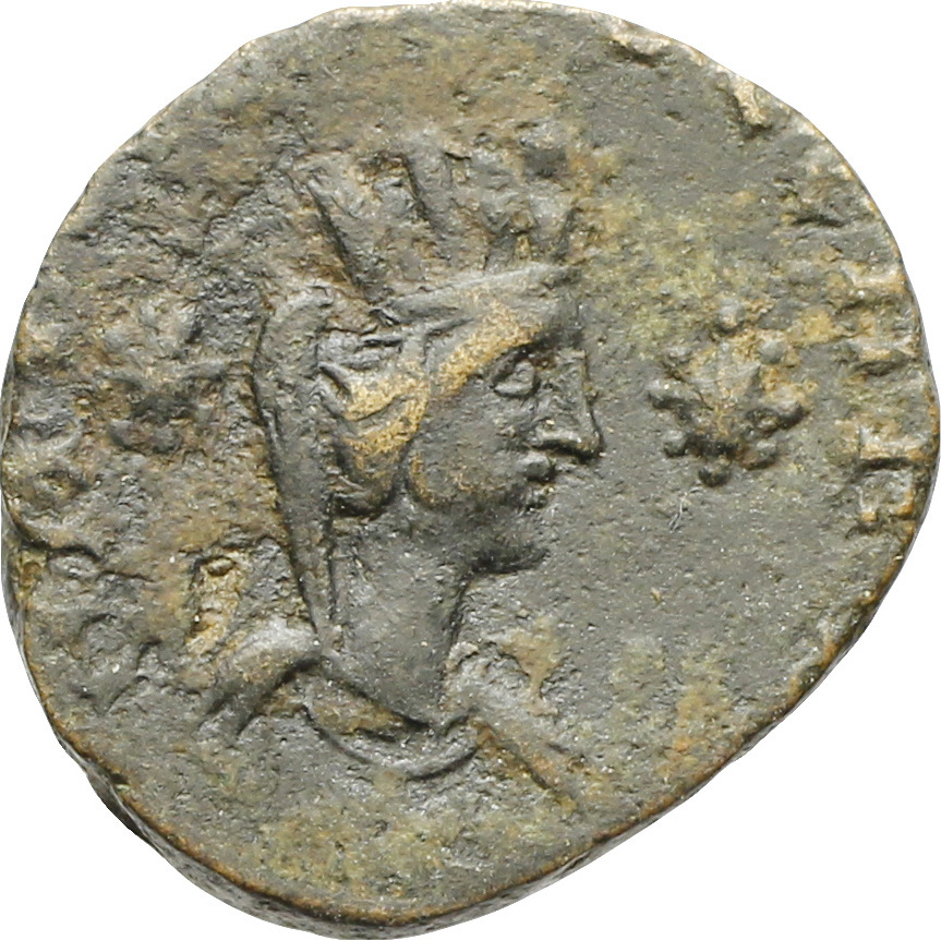 Reverse design draped, veiled and turreted bust of Tyche, right, between two stars