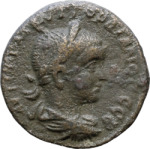 laureate, draped and cuirassed bust of Gordian III, right, seen from rear |