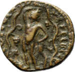 Bacchus, nude, standing facing, head right, right hand raised above head and with left embracing satyr advancing right, holding pedum; at feet, panther left; all in arch of vines with grapes