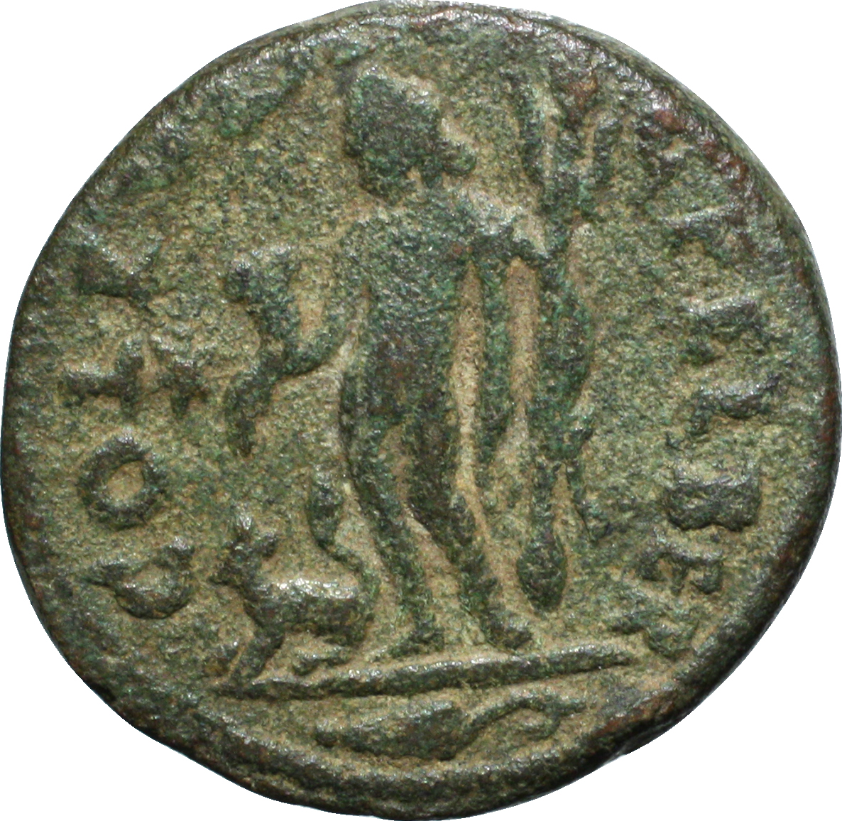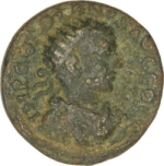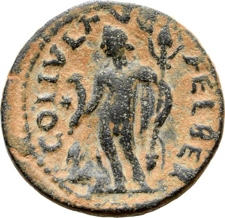 Bacchus, nude, standing facing, head left, nebris over left shoulder, holding rhyton and thyrsus; at feet, panther left; in exergue, at times vine leaf (or ear of corn?); in field, left, star