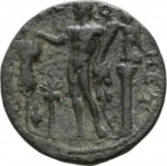 Hercules standing left, extending arm over trophy, holding club and lion skin, being crowned by Victory on column; on ground, murex shell and palm tree