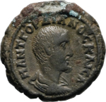 bare-headed, draped and cuirassed bust of Gordian III, right, seen from rear