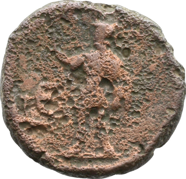 Roma standing left, holding spear and parazonium; at left, shield leaning against her leg