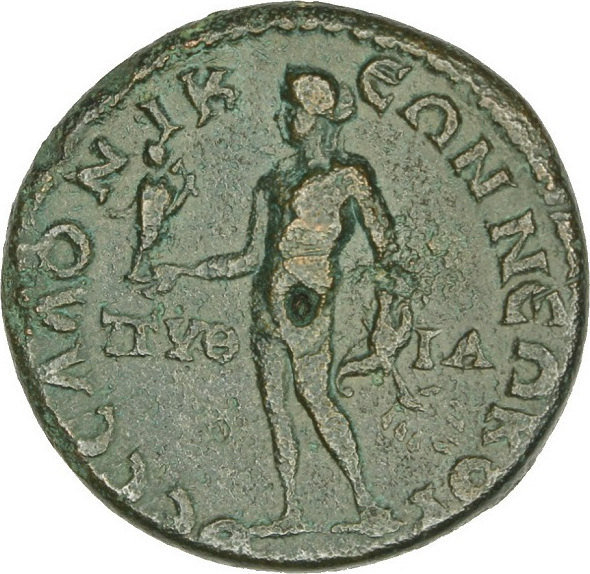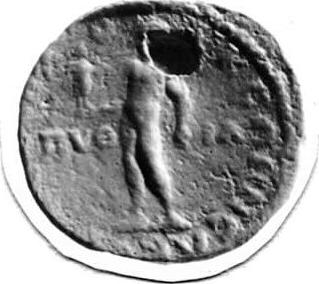 Apollo standing left, holding Kabeiros, and laurel branch and bow |
