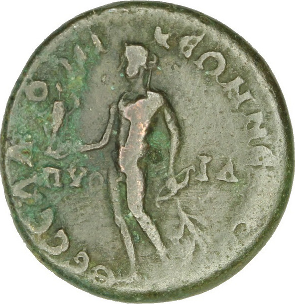 Apollo standing left, holding Kabeiros, and laurel branch and bow |