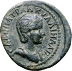 Nike standing left, holding branch and palm; at feet, five apples and agonistic crown with palm branch |