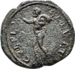 Reverse design Marsyas standing left, raising right arm, holding wineskin over left shoulder