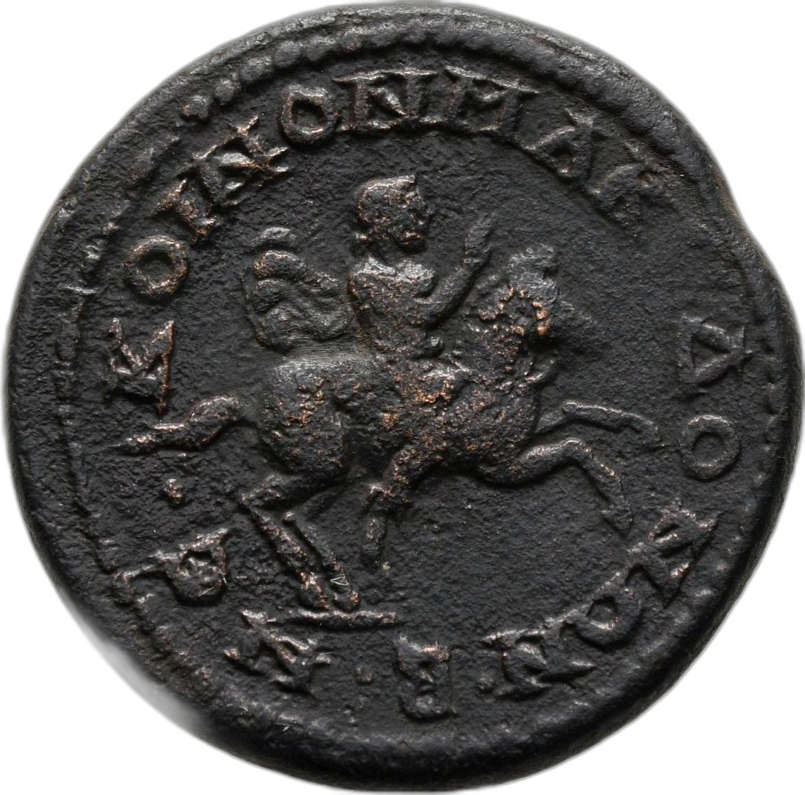 Alexander the Great riding Bucephalus advancing right, raising hand