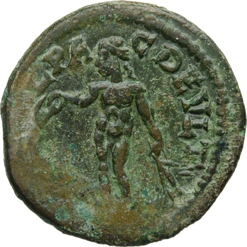 Apollo standing left, holding patera and branch
