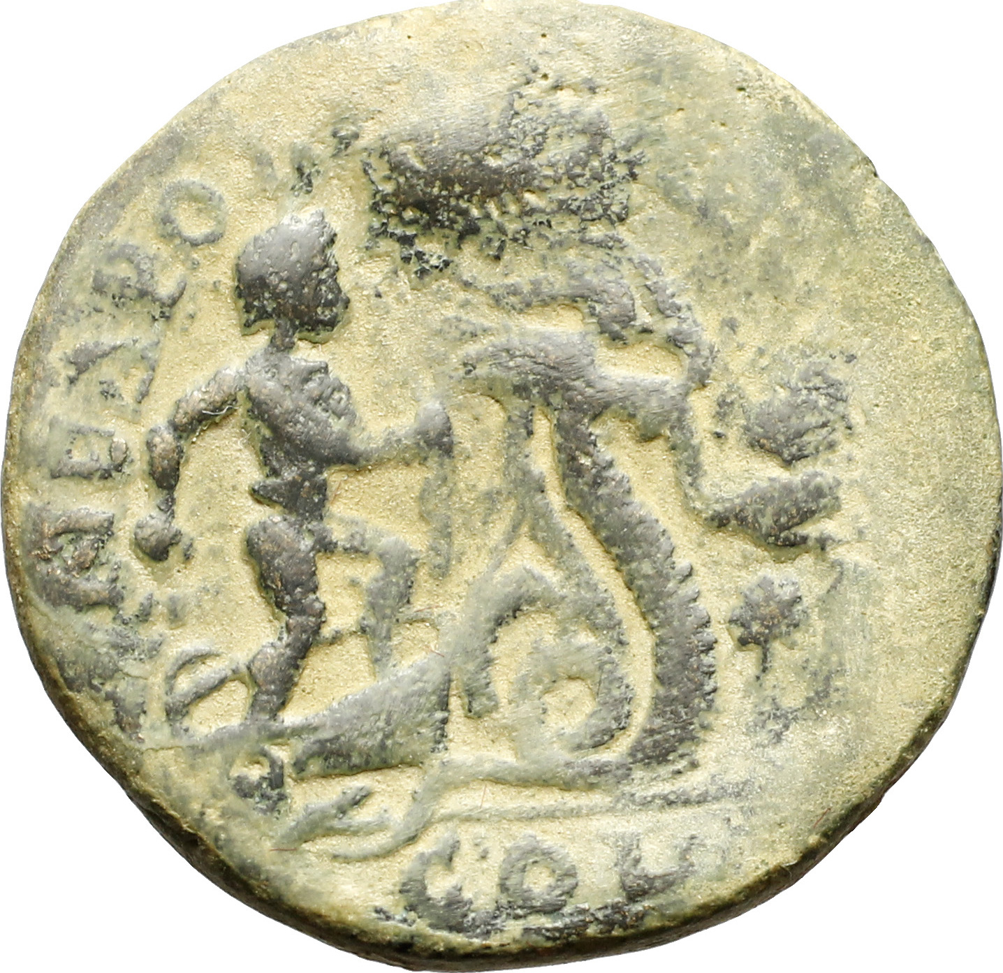 Triptolemus holding seeds in chlamys, driving biga drawn by winged serpents, right; above, Mount Gerizim; below, at right, star