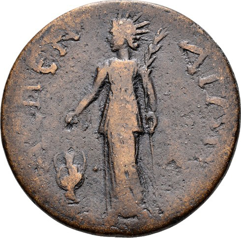 Reverse design Agon, radiate, standing left, holding palm and casting vote in vase