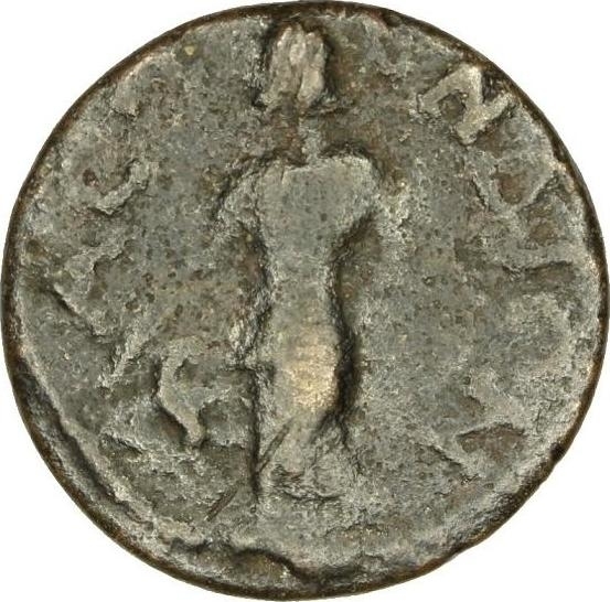 Nemesis standing left, holding cubit rule; at her feet, griffin placing forepaw on wheel