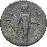 Artemis, radiate, crescent on shoulder, standing right, holding bow and arrow