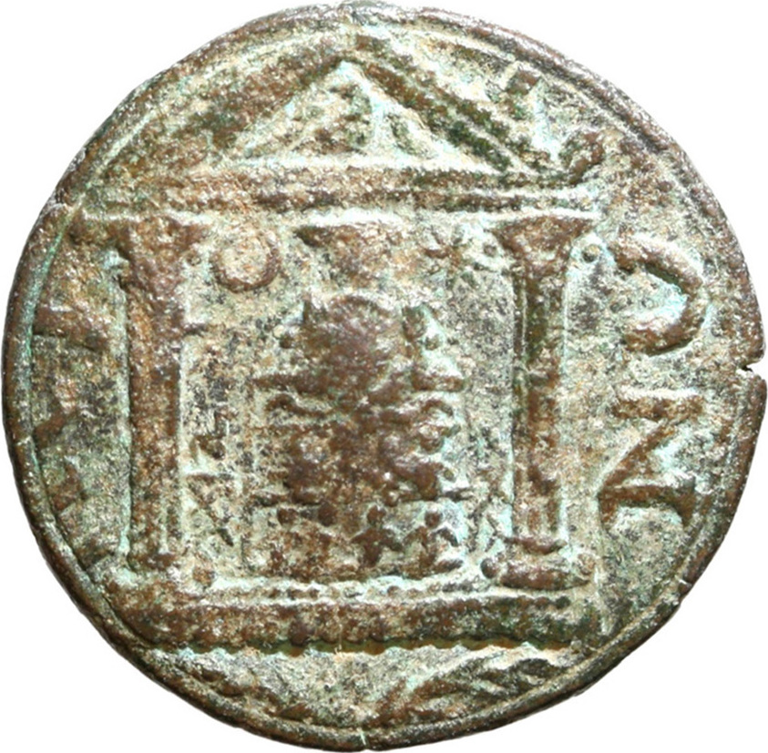 temple with two columns enclosing cult statue of Artemis Pergaia between crescent and star; eagle in pediment; below the temple, two palms