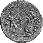 Apollo killing Python: at left, tripod; nude Apollo, standing right, with quiver on shoulder, bending a bow, facing Python, standing on rocks, below a tree; at right, a nude female figure (a Sibyl?), viewed from back, head left; on the rocks, at right, a reclining female figure (Gaia?), head left |