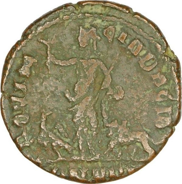 Pax standing left, holding branch and sceptre; at left, eagle standing left, head right, holding wreath in beak; at right, lion standing left