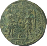Gallus(?) facing, head right, holding spear, extending right hand to Ares standing left, helmeted, holding Nike and and spear |