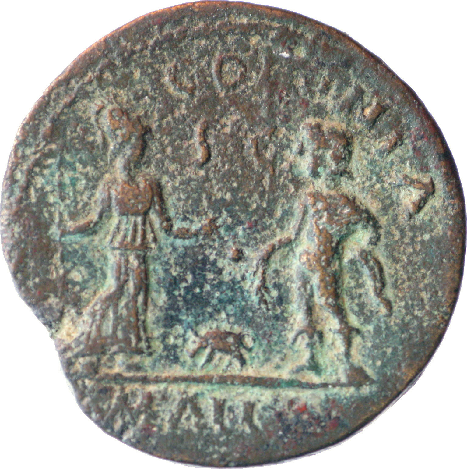 Minerva standing right, holding spear, extending right hand to founder Amphilochus (youthful) in guise of Apollo standing left, chlamys over left arm and holding branch; boar between them
